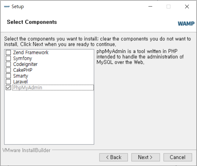 오른쪽 그림의 상태일 때 모든 체크박스를 해제. PhpMyAdmin은 필수이므로 체크 해제 불가 Next