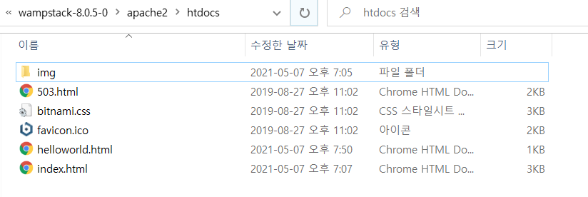 - index.html의 위치 (bitnami가 설치된 위치에 따라 다르겠지만, C:\Bitnami\wampstack-8.0.5-0\apache2\htdocs)