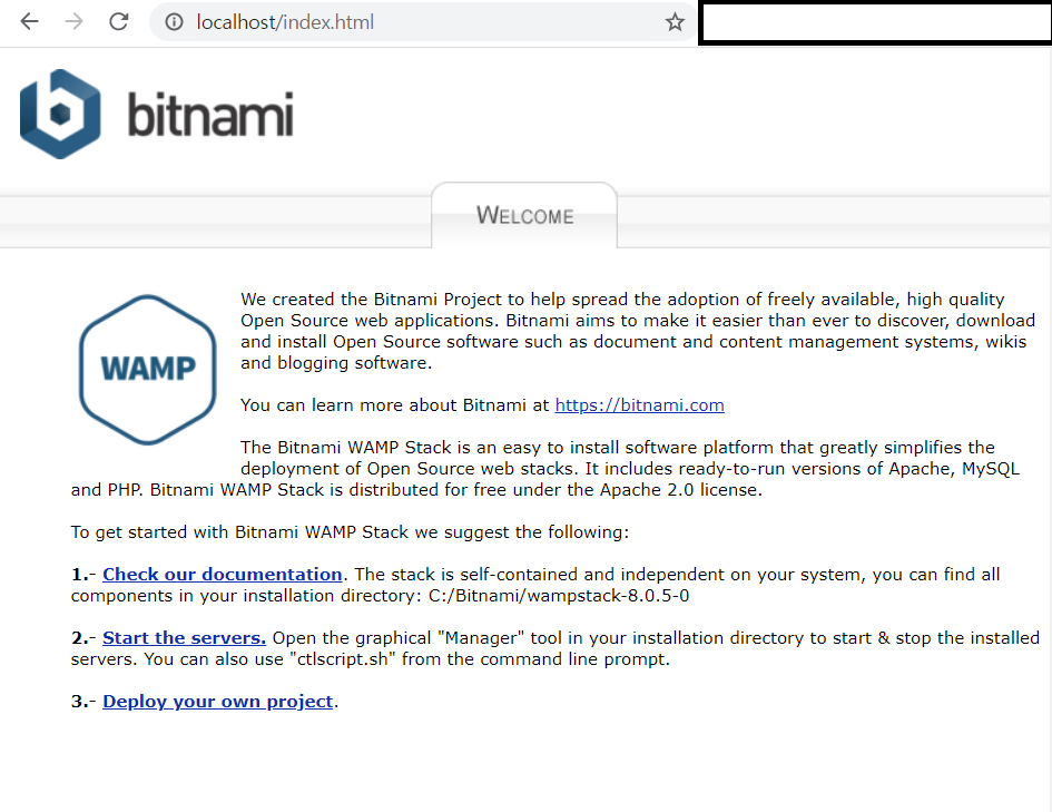 bitnami wamp를 다운하고 웹에서 localhost/index.html을 했을 때 아래의 화면이 나오면 설치 완료