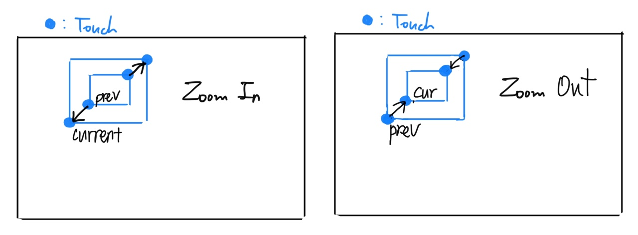 deltaDistance 는 (현재 두 손가락 사이 거리) - (이전 두 손가락 사이 거리)로 양의 값이면 줌인 / 음의 값이면 줌아웃이 된다.