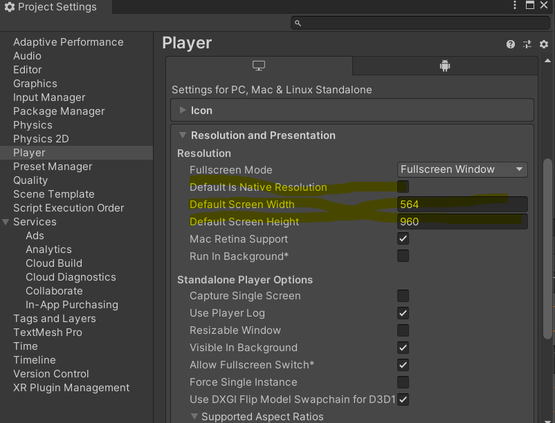Project Settings에서 Player->Resolution and Presentation 탭의 Default Is Native Resolution 을 체크 해제하고 타겟 해상도 (예 564*960)를 지정해준다.