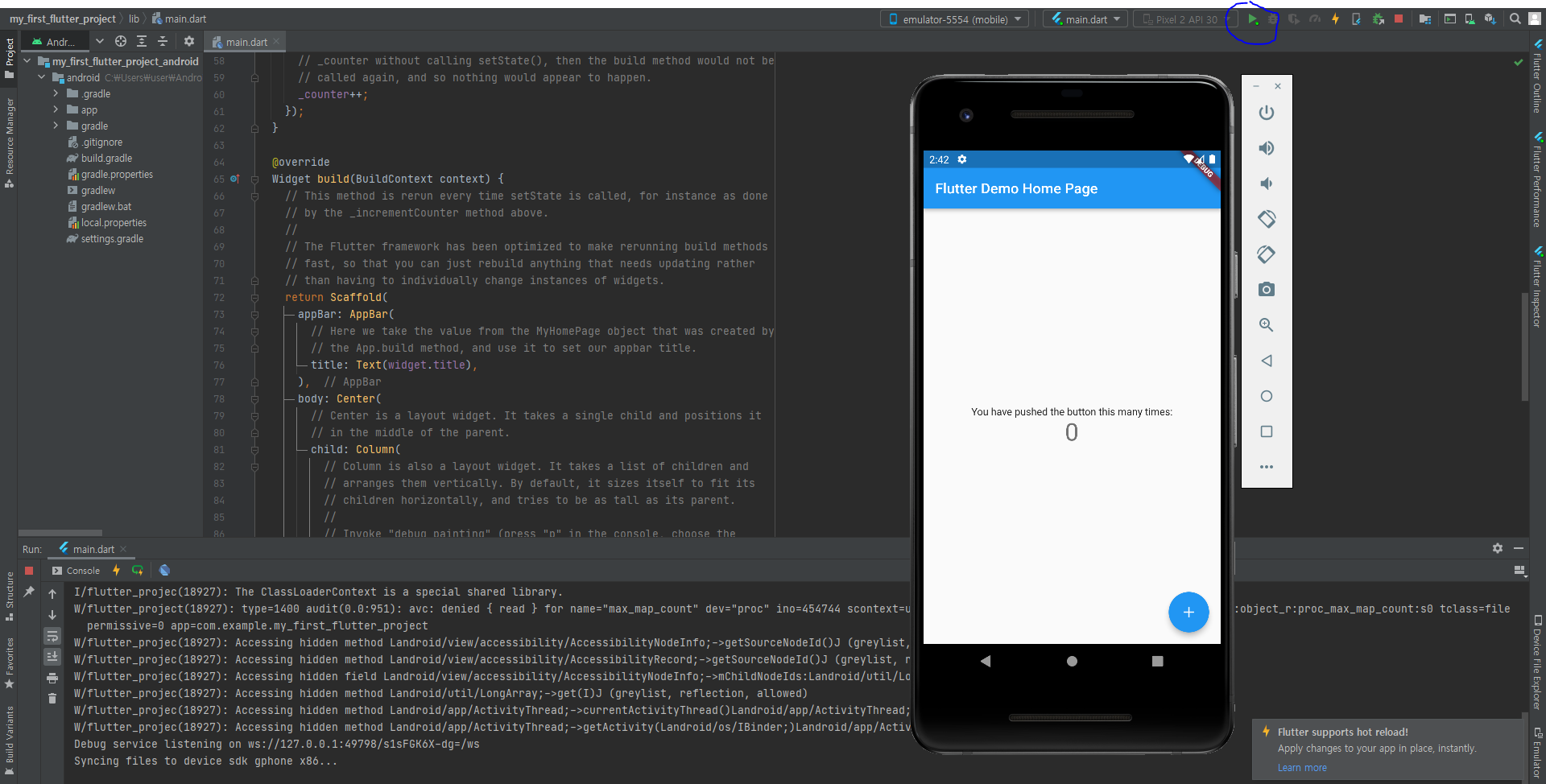 저 버튼으로 Flutter 프로젝트를 시작할 수 있다.