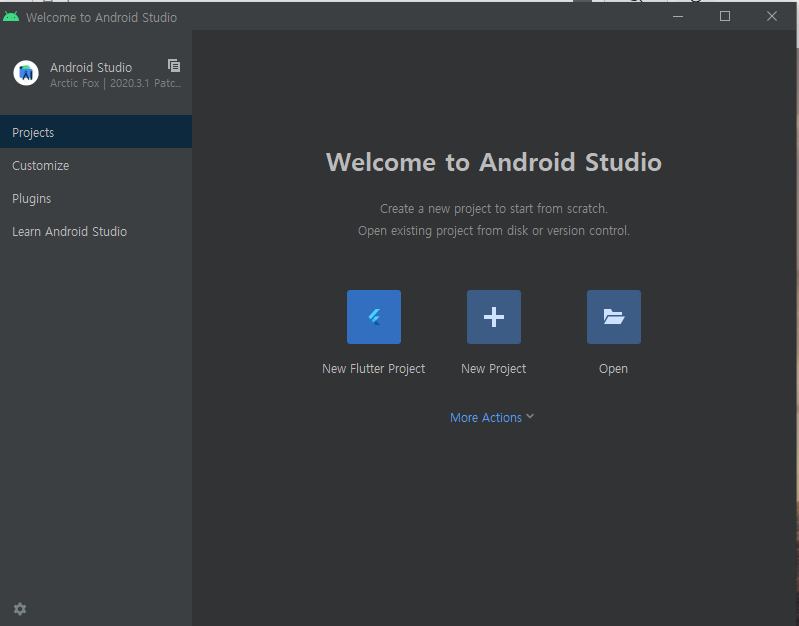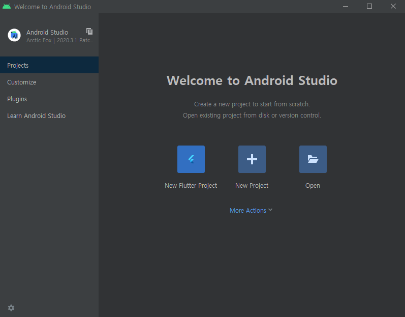 안드로이드 스튜디오 화면에 New Flutter Project 버튼이 생긴 것을 확인할 수 있다.