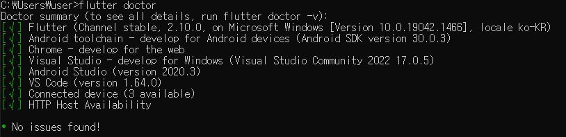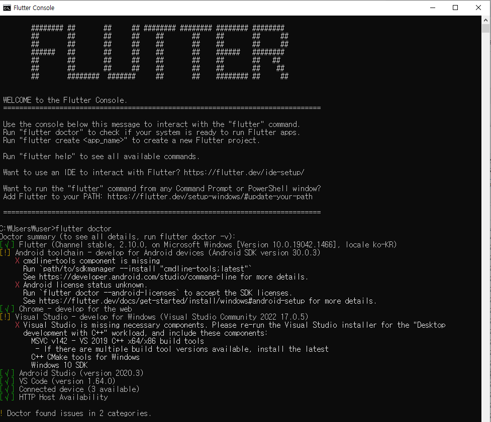 다시 flutter doctor를 cmd에 입력해 설치 상태를 점검한다.