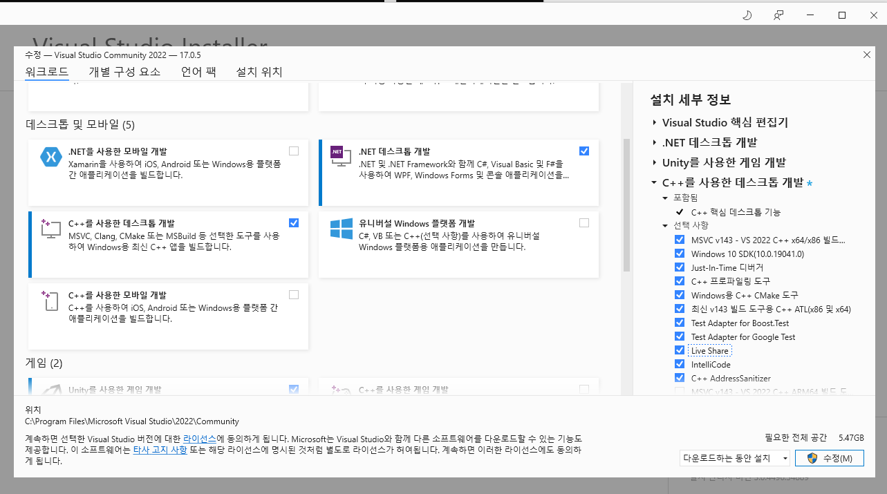 -> 현재 가지고 있는 Visual Studio 개발환경에 "C++을 사용한 데스크탑 개발" 컴포넌트가 없다는 것이므로 설치해준다.
