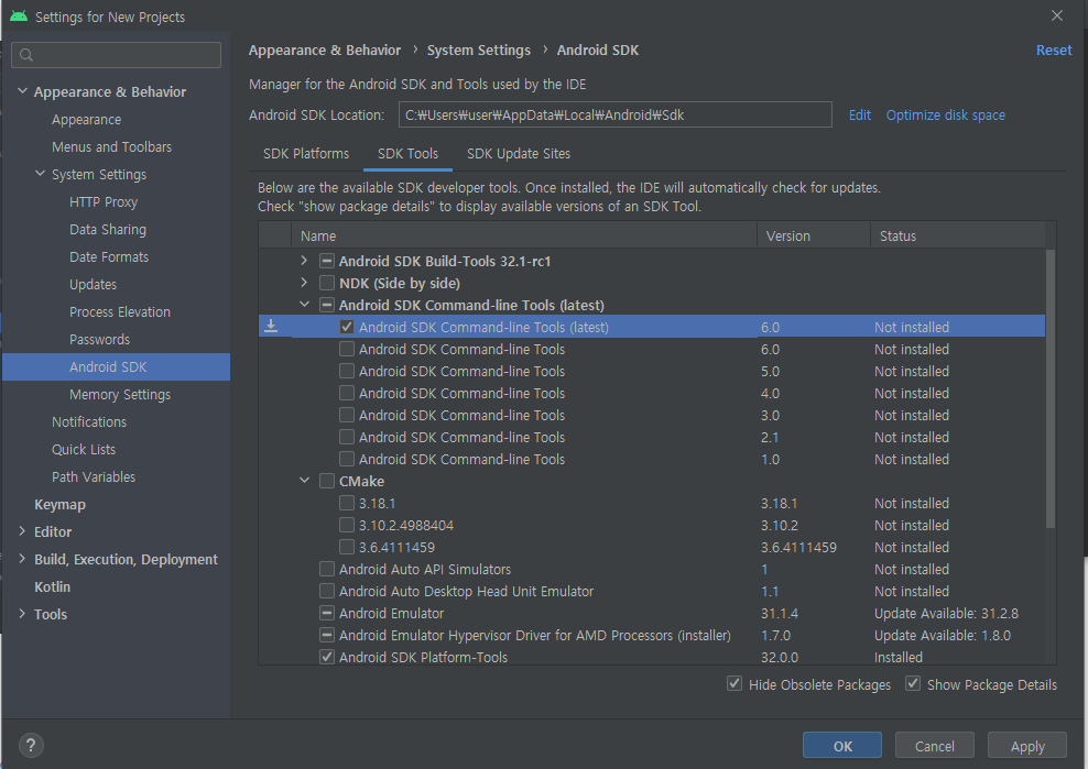 android studio의 sdk manager에서 SDK Tools 탭에서 Android SDK Command-line Tools(latest)를 다운 받는다. Show Package Details를 눌러서 latest 버전만 체크해 다운 받는다. Apply 버튼을 클릭하면 다운로드할 수 있다.
