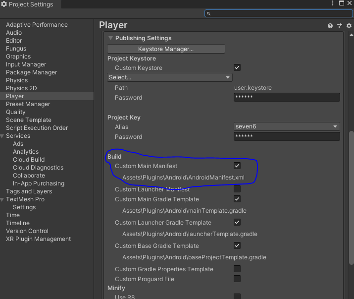 ProjectSettings -> Player -> Publishing Settings -> Build 에서 Custom Main Manifest 를 체크하면 파일이 자동으로 생성된다.