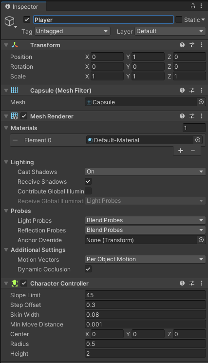 CharacterController는 기본적으로 Capsule collider를 가지고 있고 또한, rigidbody가 없이 충돌에 의한 움직임을 다루기 쉽도록 해준다.