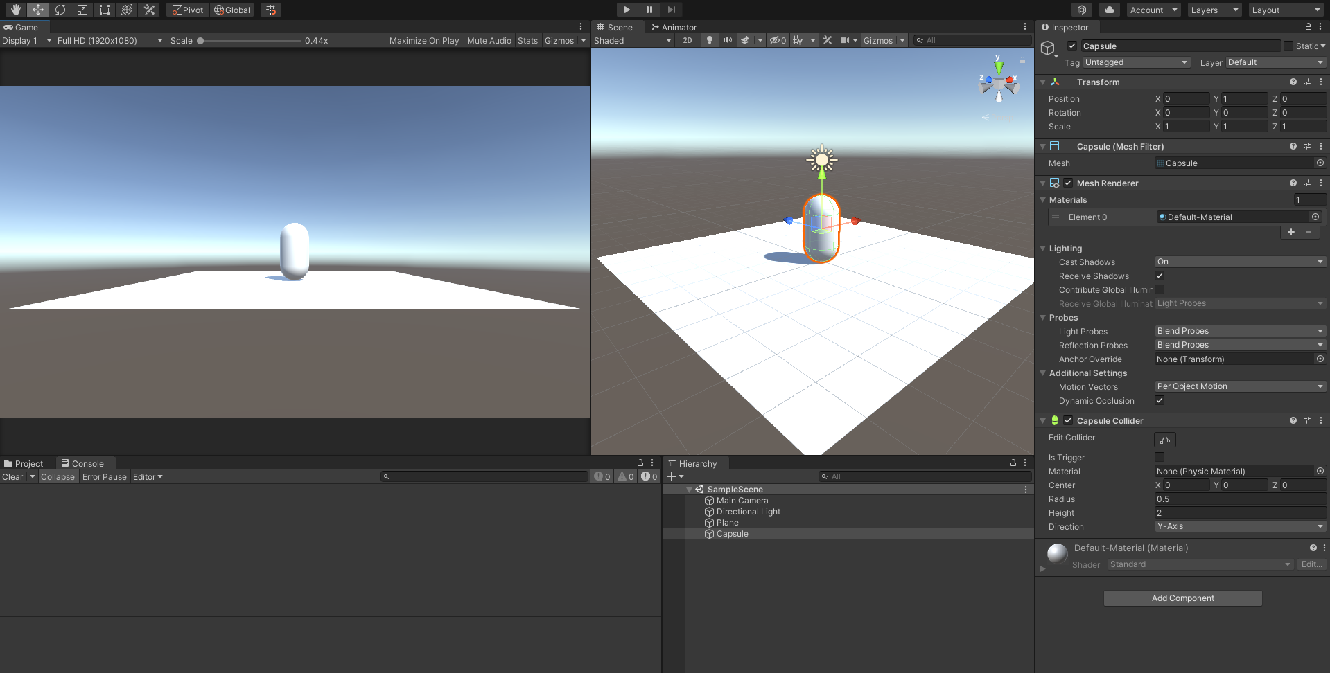 먼저 캐릭터로 쓸 Capsule 오브젝트와 땅 Plane 오브젝트를 생성한다.