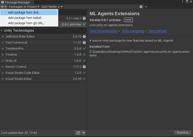 Clone 받은 ml-agent 폴더에서 com.unity.ml-agents와 com.unity.ml-agents.extensions 안 package 파일을 import 합니다.