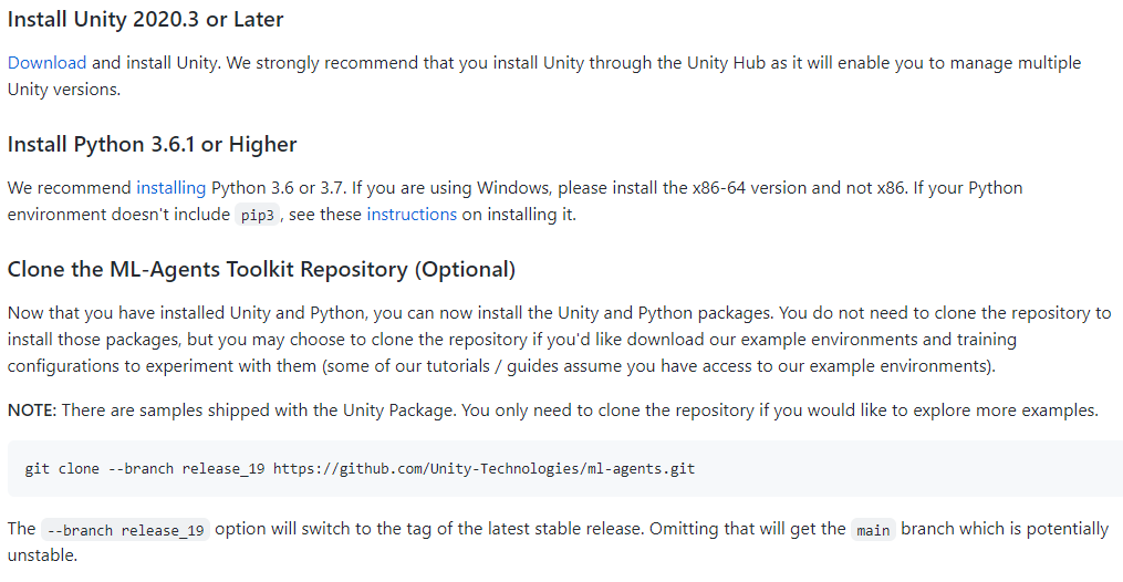 Unity github installation 가이드를 보면 유니티, 파이썬, ml-agent의 설치가 필요하다고 나와있습니다.