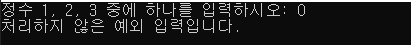 Console.Write("정수 1, 2, 3 중에 하나를 입력하시오: ");