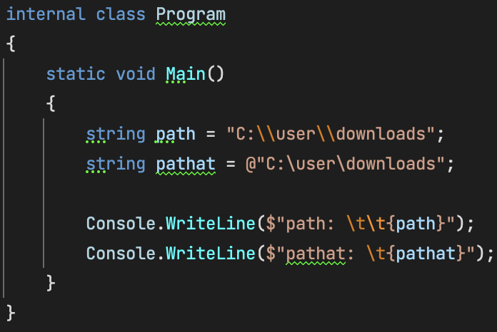 '@'을 사용하는 축자 텍스트를 사용하면 C# 키워드를 식별자로 사용하거나 문자열 리터럴을 축자로 해석하거나 특성 이름을 구분해야 했음을 나타냅니다.